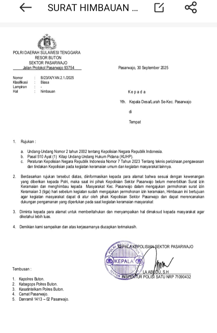 LintasButon.com, Pasarwajo – Kepolisian Sektor (Polsek) Pasarwajo, Kabupaten Buton, resmi mengeluarkan surat himbauan kepada seluruh kepala desa dan lurah se-Kecamatan Pasarwajo terkait penyelenggaraan kegiatan keramaian. Himbauan tersebut tertuang dalam surat bernomor B/23/IX/YAN.2.1/2025 yang ditandatangani langsung oleh Kapolsek Pasarwajo, IPTU La Abudu, S.H., pada 30 September 2025.